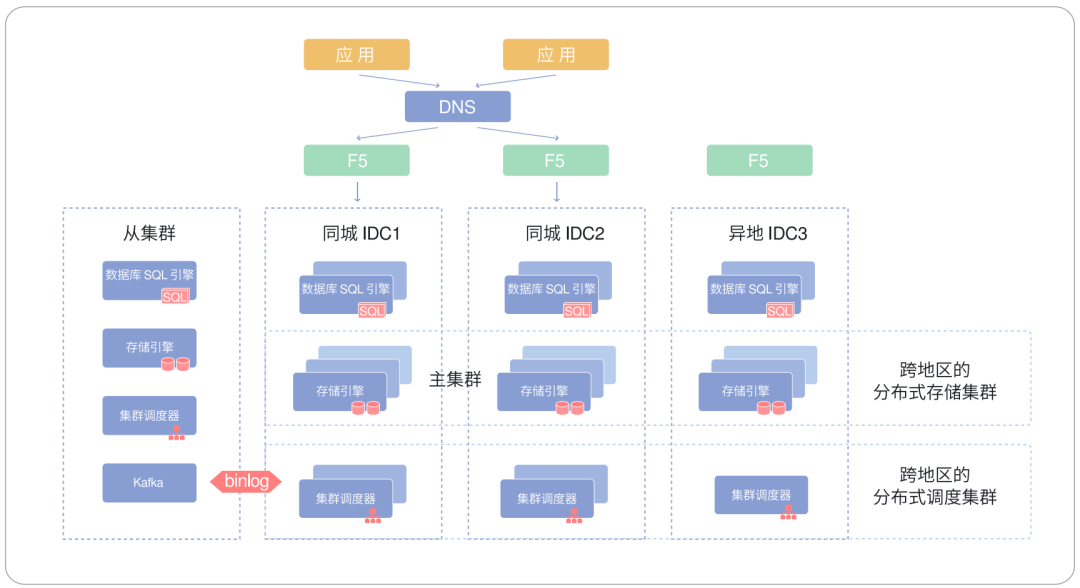 北京银行在两地三中心部署 TiDB 集群,采用主从的多活架构,主集群作为生产集群承担日常的生产服务,主从之间采用 Kafka 同步 Binlog 的形式进行数据同步。