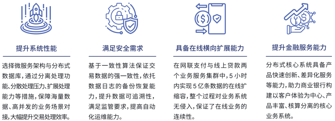 2018 年起,该分布式核心系统对接网联支付清算平台、银联无卡快捷支付平台、金融服务互联平台、网贷业务平台等多个核心金融业务场景,实现了将分布式数据库解决方案应用于银行核心类业务场景。