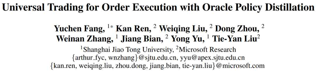 编者按:随着近年来深度强化学习技术的发展,学术界提出了一些利用深度强化学习解决订单执行问题的方法。微软亚洲研究院与上海交通大学合作在 AI+ 金融领域的最新研究工作《Universal Trading for Order Execution with Oracle Policy Distillation》就是利用了强化学习技术,来尝试优化金融市场交易中订单执行(Order Execution)的问题。该工作已被 AAAI 2021 接收。