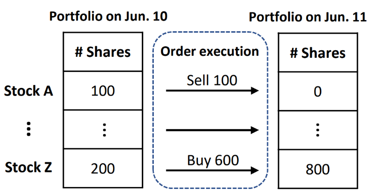 以最大化长期收益为目标的投资行为往往涉及一系列针对资产组合(Portfolio)的调整,这中间就包括订单执行任务。以股票投资为例,如图1所示,若投资人想要进行股票持仓的调整,则需要通过执行一系列买单或卖单来买入或卖出一定数量的特定股票。