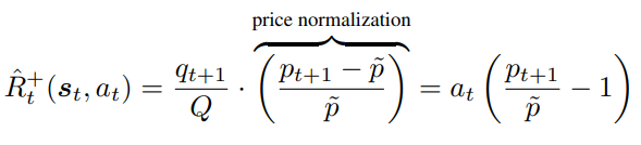 为了提高训练效率,充分利用所有数据,研究员们设计了一个归一化的奖励函数,使得策略能够针对全股进行优化,而非专门针对单一股票进行决策优化。如图3所示,在奖励函数中,p ̃ 为给定股票在整个交易时间段内的平均价格,p_t 为 t 时刻的价格,Q 为订单总量,q_t 为 t 时刻的交易量。在 t 时刻,用总订单量归一化 t 时刻交易量,用平均价格归一化 t 时刻价格,从而可以用全股的数据优化强化学习策略。