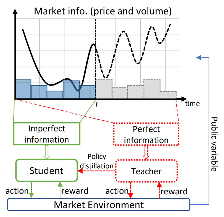 具体来说,将完美的信息作为输入训练一个先知策略(Oracle Policy),该策略容易学到最优的交易行为,然后再利用策略蒸馏(Policy Distillation)方法,让先知策略作为“教师”,指导只能观察到不完美信息的“学生”(普通策略)进行学习。在真实的交易场景下,则没有先知“教师”的参与,只有普通策略自行交易。