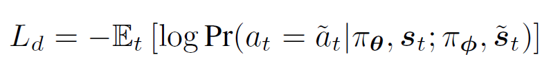 为了让“学生”能从“教师”那里学习到最优的交易决策,研究员们在强化学习优化算法 PPO [2]( Proximal Policy Optimization)的损失函数基础上,增加了图6的蒸馏损失(Distillation Loss),最小化“学生”和“教师”行为之间的负似然(Negative Log-likelihood)损失,从而使得“学生”的决策能和“教师”选择的最优策略更加接近。
