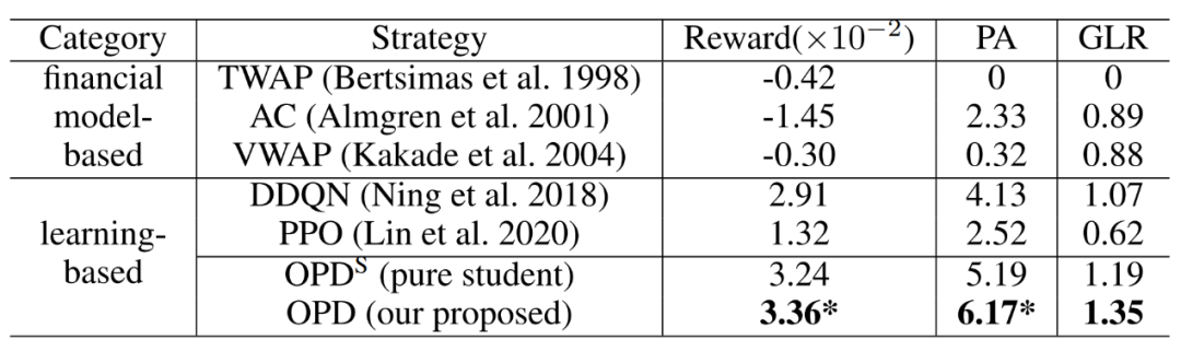 研究员们将该方法和基于模型的传统方法以及无模型的强化学习方法两类进行了比较,并比较了“有/无教师策略指引”的结果,表2为回测评估结果。研究工作的先知策略蒸馏方法(OPD)显著超越了其它已有方法,也超过了“无教师指引的学生”(OPD^S),取得了更高的奖励(Reward)和价格优势(Price Advantage, PA)。