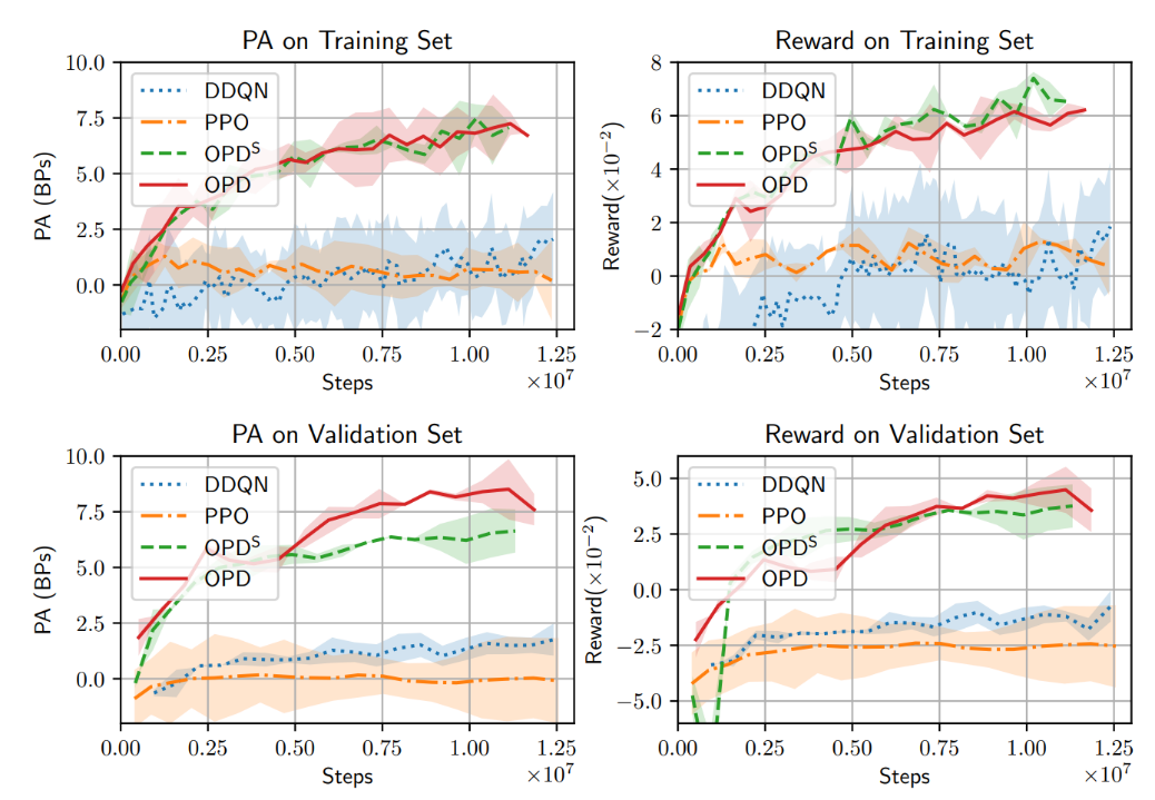 如图7所示,从学习曲线中可以看出,OPD 和 OPD^S 在验证集上的效果差距相比训练集明显提升,这也表明了先知策略的指引可以让“学生”学习到泛化性更好、更有效的交易策略。