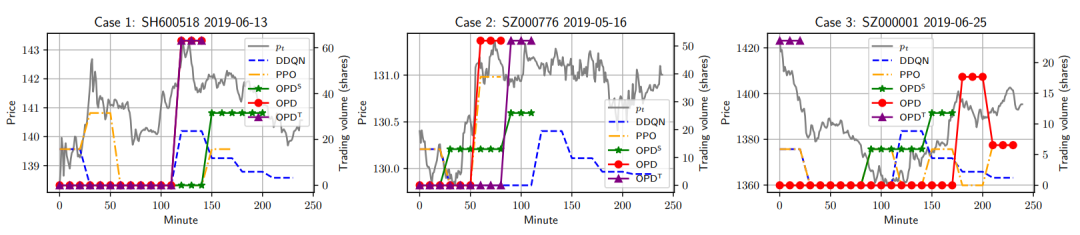 图8则展示了多个强化学习方法生成的策略的最终订单执行结果,其中 OPD^T 代表先知策略。可以看到,OPD 往往能做出和 OPD^T 一致或相似的行为(case 1,2),这表明先知策略蒸馏确实让“学生”学习到了合理的策略。然而,当不完美信息与完美信息差距过大时,例如在一天的开始阶段,由于可观察到的信息太少,所以 “学生”很难做出完美的决策,往往会错过一天开始阶段的最优交易机会(case 3)。但即便如此,“学生”也能在接下来的时间中做出次优的决策来弥补损失,其效果仍超越了其它的方法。