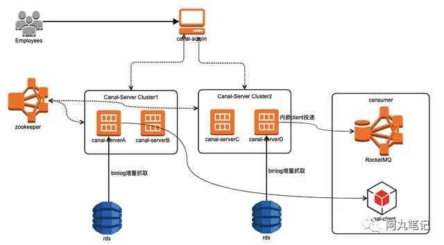 多个canal-server可以组成集群模式,每个instance任务通过zookeeper在集群中实现高可用