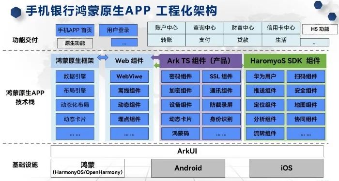 鸿蒙原生组件,以ArkTS与NDK(即NAPI)结合构建原生组件,以满足交易组装、安全防护、场景适配等功能。