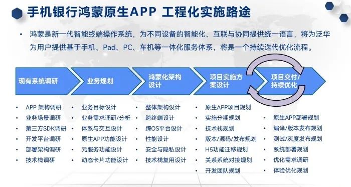 从当前鸿蒙原生APP工程化的实施过程来看,大体可分解为现有系统调研、业务规划、鸿蒙化架构设计、项目实施方案设计和项目交付和持续优化等阶段。