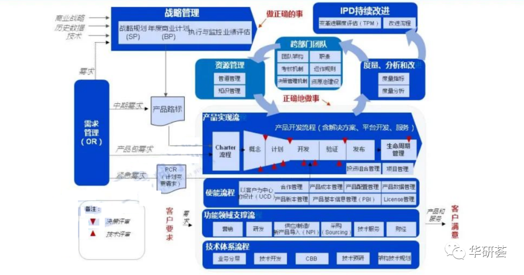 上图是IPD主流程的运作图,我们会发现,IPD流程又可以分为很多小的流程,这些流程有的是确保公司的产品开发是做正确的事,有的是正确的做事,有的是把事情做正确,最后让客户满意。