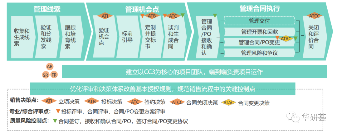 华为把整个销售运作的全过程分为三个阶段:管理线索、管理机会点、管理合同执行(履约)。
