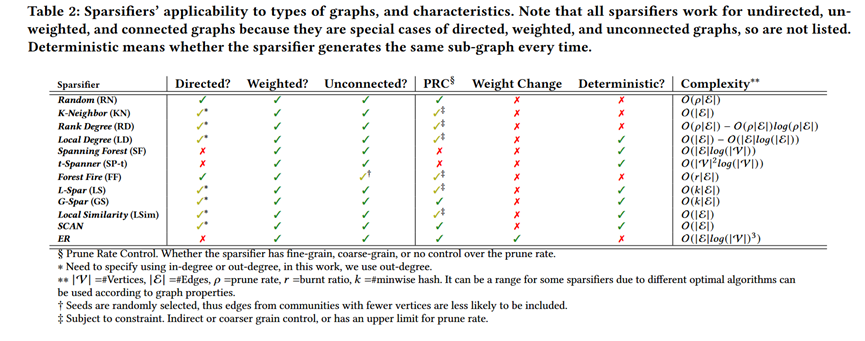 图稀疏化(Graph Sparsification)通过顶点和/或边的子集的稀疏图来近似给定图。有效的稀疏化算法的目标是保持与下游任务相关的特定图属性,同时最小化图的大小。由于不规则性和大的真实世界图尺寸,图算法经常需要较长的执行时间。通过用更小的稀疏化图替换完整图,可以大大减少图算法的运行时间,而不会显著降低输出质量。然而,众多稀疏化器(sparsifiers)和图属性之间的相互作用并没有得到广泛的探索,图稀疏化的潜力也没有得到充分的理解。该文涵盖了16个广泛使用的图度量、12个代表性的图稀疏化算法和14个跨各种类别的真实世界数据图。该文综述的sparsifiers如下表所示。