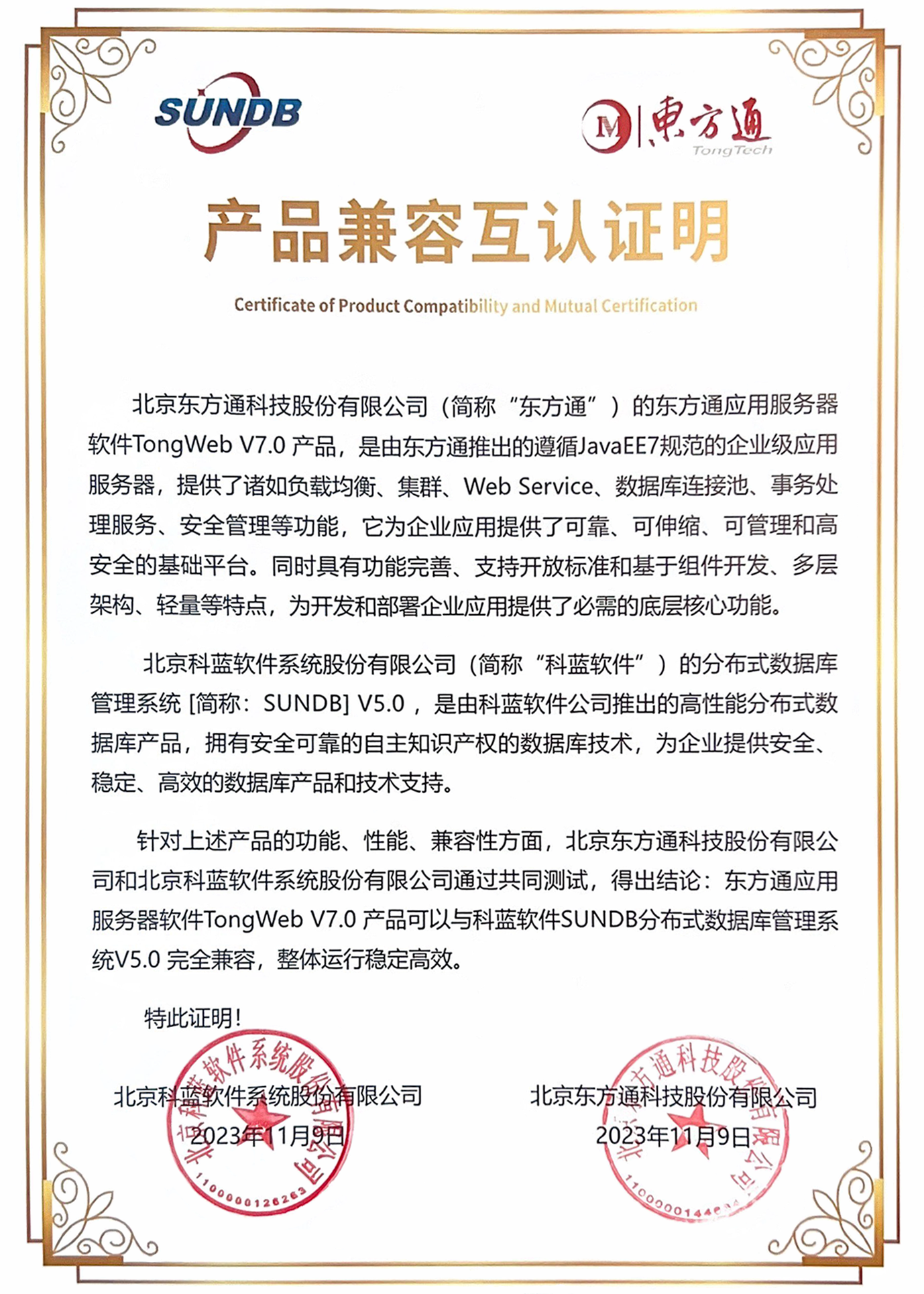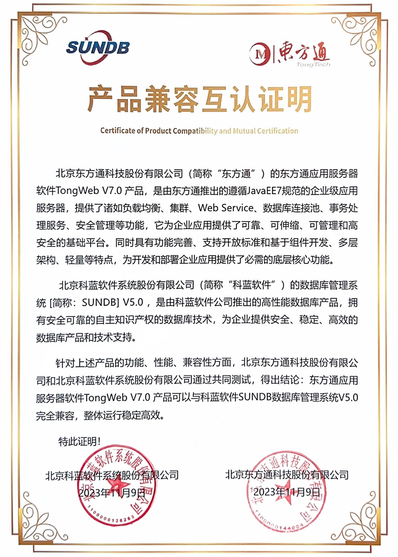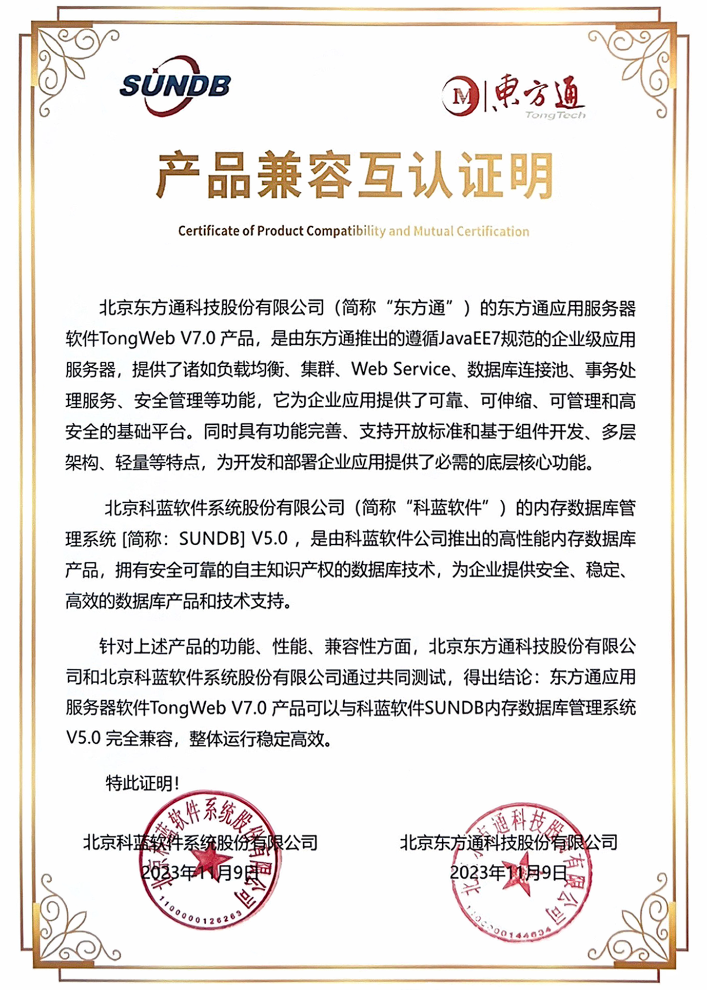 北京科蓝软件系统股份有限公司与北京东方通科技股份有限公司完成产品互兼容适配认证。通过共同测试,科蓝软件SUNDB数据库管理系统 V5.0、SUNDB分布式数据库管理系统 V5.0、SUNDB内存数据库管理系统 V5.0与东方通应用服务器软件TongWeb V7.0产品完全兼容,整体运行稳定高效。
