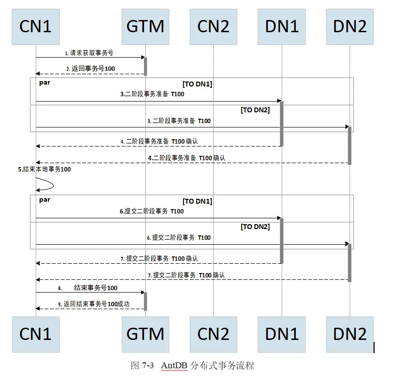 AntDB 分布式事务流程可参见图3-2,为方便阅读,复制于此,如图7-3 所示。
