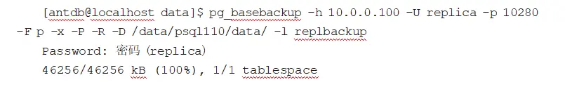 从此处开始配置从库(10.0.0.110),首先要通过 pg_basebackup 命令行工具在从库上生成基础备份: