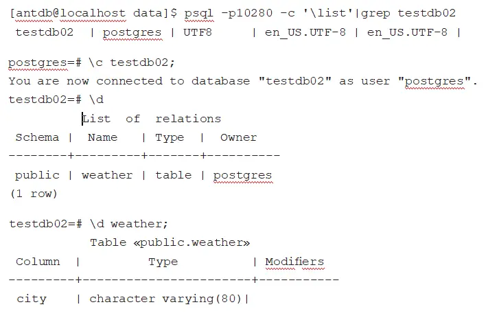 [antdb@localhost pg_xlog]$ psql -p10280 -c '\list '|grep testdb02