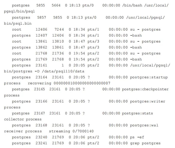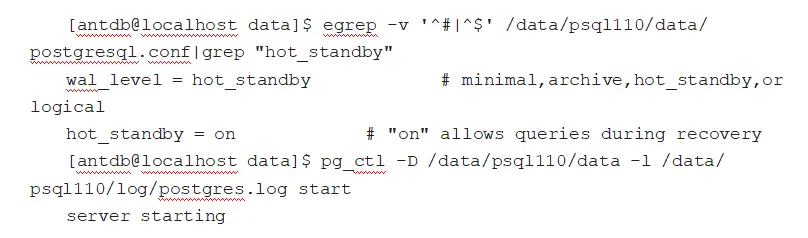 如上由于在 pg_hba.conf 中指定的 MD5 认证方式,所以需要输入密码。最后还需要修改一下从库数据目录下的 postgresql.conf 文件,将 hot_standby 改为启用状态,即 hot_standby=on。到此为止就算配置结束了,现在可以启动从库: