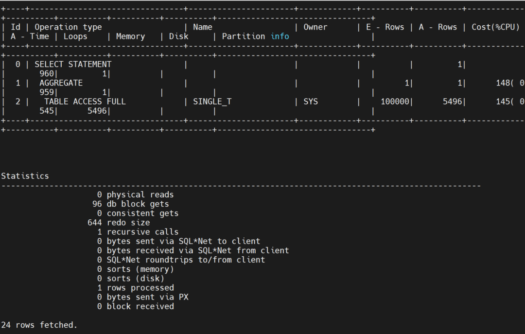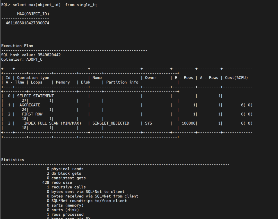 select max(object_id) from single_t;未加索引前,整个表走了全表索引,约花费了96个db blocks get