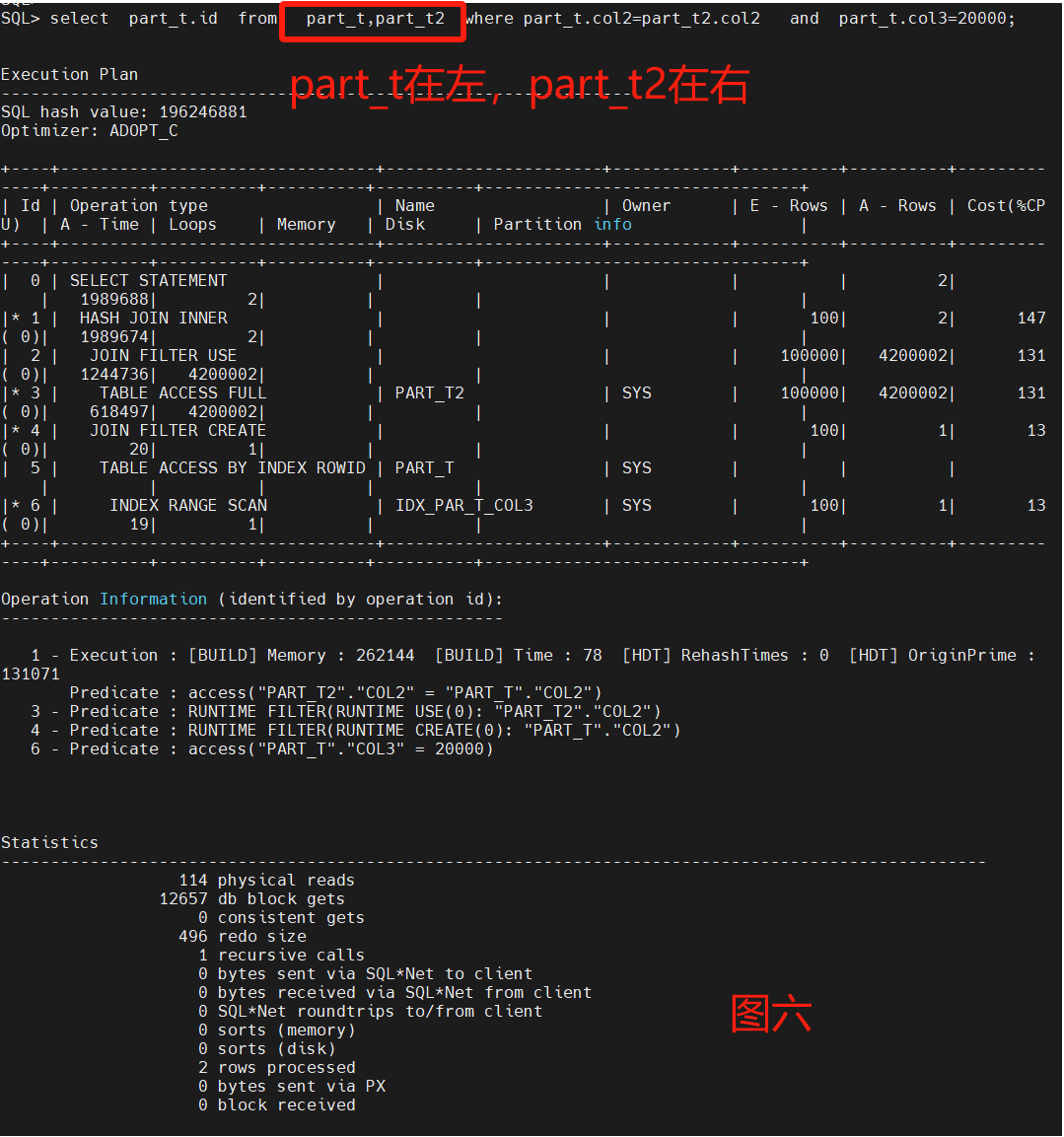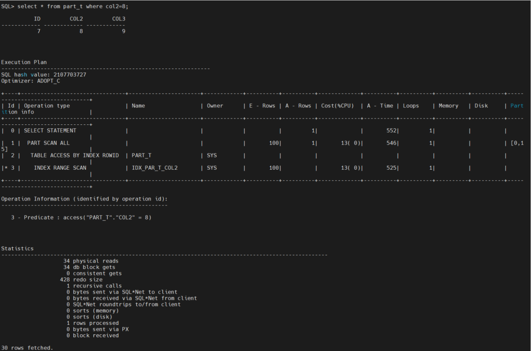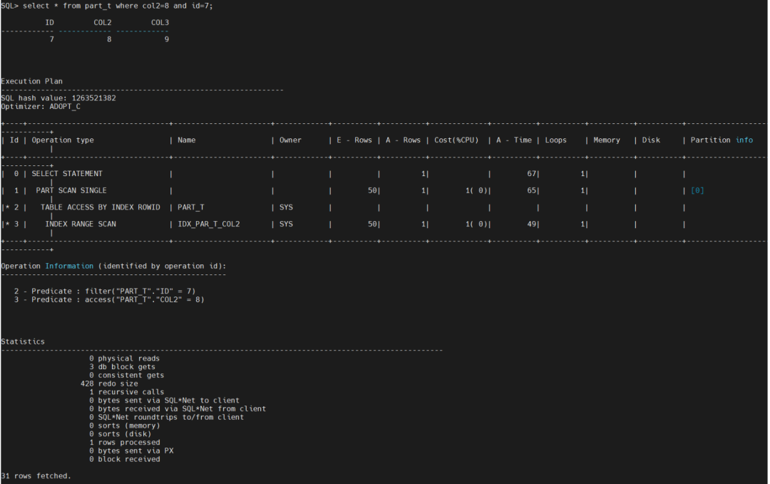 select * from part_t where col2=8 and id=7 因为有分区索引,所以路径上走了分区的查找,只花费了3个db blocks gets。