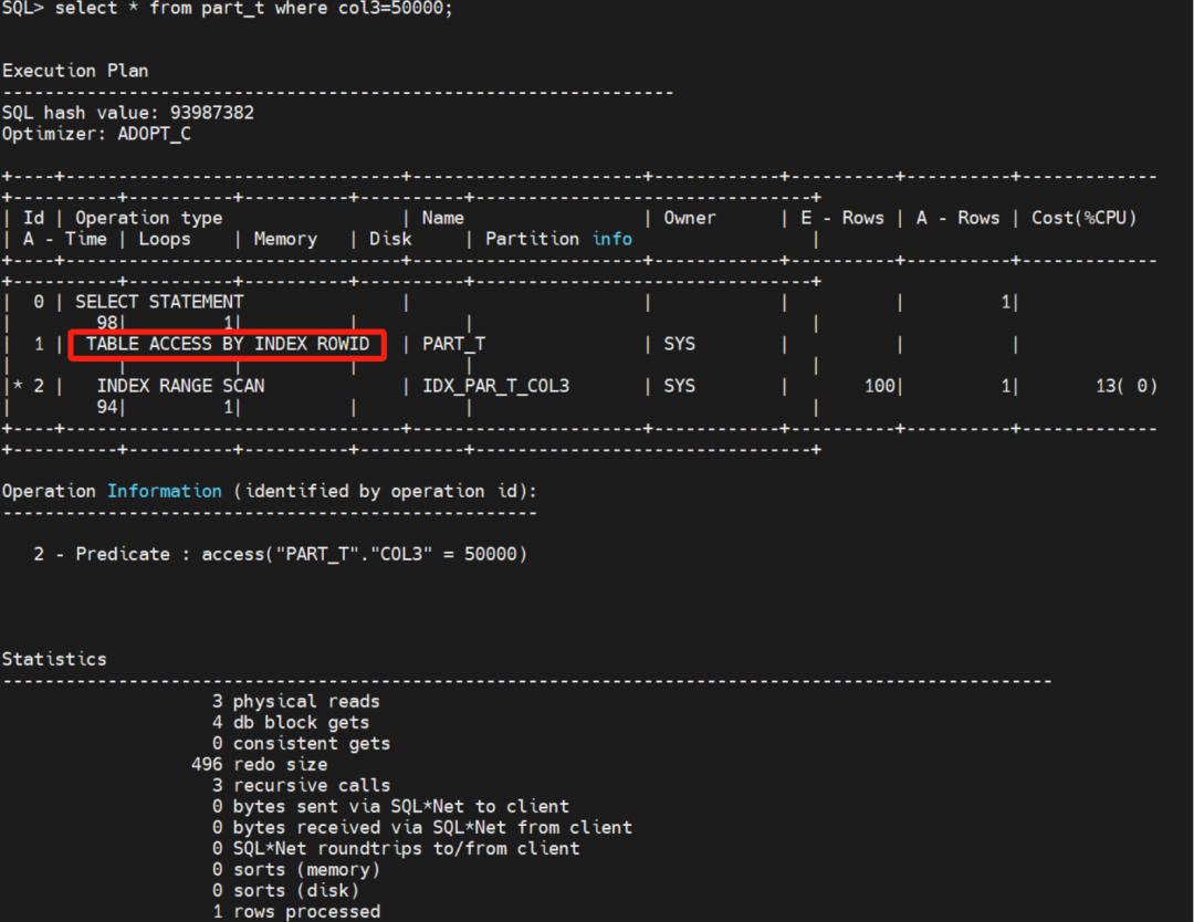 select * from part_t where col3=50000 很明显因为*走了回表。3个物理读 ,4个逻辑读 。
