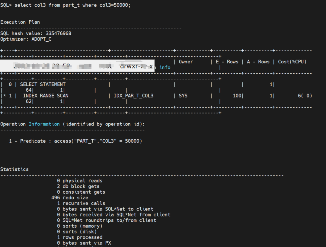 select col3 from part_t where col3=50000 我们把*改成索引对应值,回表就消失了,只有2个db block