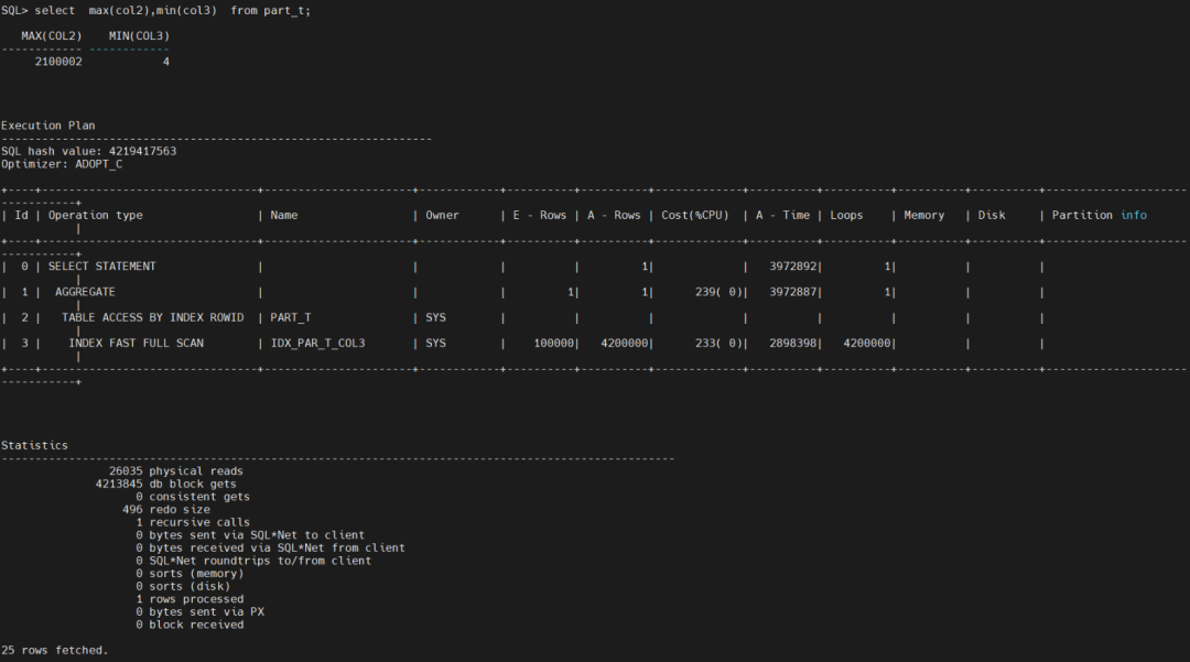 select max(col2),min(col3) from part_t; 发现还是走了索引,物理读和逻辑读 差不多。