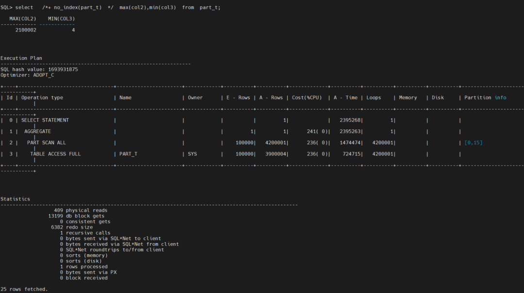 select *+ no_index(part_t) */ max(col2),min(col3) from part_t; 通过HINT没有走索引,终于走了全盘扫描,物理读和逻辑读比原来好很多了。