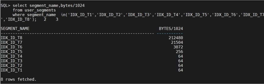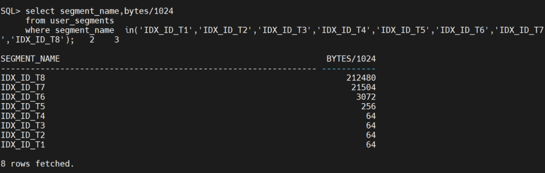 USER_SEGMENTS 用于查询每个表拥有的段,列出idx_id_t1到idx_id_t8一共8个索引的占用段大小。最小索引占用的段64KB。
