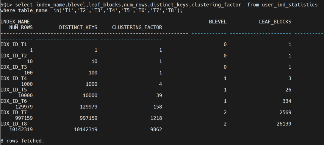 drop table t1 purge;drop table t2 purge;drop table t3 purge;drop table t4 purge;drop table t5 purge;drop table t6 purge;drop table t7 purge;drop table t8 purge;create table t1 as select rownum as id,rownum+1 as id2 from dual connect by level<=1;create table t2 as select rownum as id,rownum+1 as id2 from dual connect by level<=10;create table t3 as select rownum as id,rownum+1 as id2 from dual connect by level<=100;create table t4 as select rownum as id,rownum+1 as id2 from dual connect by level<=1000;create table t5 as select rownum as id,rownum+1 as id2 from dual connect by level<=10000;create table t6 as select rownum as id,rownum+1 as id2 from dual connect by level<=100000;create table t7 as select rownum as id,rownum+1 as id2 from dual connect by level<=1000000;create table t8 as select rownum as id,rownum+1 as id2 from dual connect by level<=10000000;create index idx_id_t1 on t1(id);create index idx_id_t2 on t2(id);create index idx_id_t3 on t3(id);create index idx_id_t4 on t4(id);create index idx_id_t5 on t5(id);create index idx_id_t6 on t6(id);create index idx_id_t7 on t7(id);create index idx_id_t8 on t8(id);BEGINDBMS_STATS.GATHER_INDEX_STATS('sys', 'idx_id_t1', '', 0.2, 2,'ALL');DBMS_STATS.GATHER_INDEX_STATS('sys', 'idx_id_t2', '', 0.2, 2,'ALL');DBMS_STATS.GATHER_INDEX_STATS('sys', 'idx_id_t3', '', 0.2, 2,'ALL');DBMS_STATS.GATHER_INDEX_STATS('sys', 'idx_id_t4', '', 0.2, 2,'ALL');DBMS_STATS.GATHER_INDEX_STATS('sys', 'idx_id_t5', '', 0.2, 2,'ALL');DBMS_STATS.GATHER_INDEX_STATS('sys', 'idx_id_t6', '', 0.2, 2,'ALL');DBMS_STATS.GATHER_INDEX_STATS('sys', 'idx_id_t7', '', 0.2, 2,'ALL');DBMS_STATS.GATHER_INDEX_STATS('sys', 'idx_id_t8', '', 0.2, 2,'ALL');END;/select index_name,blevel,leaf_blocks,num_rows,distinct_keys,clustering_factorfrom user_ind_statistics where table_namein('T1','T2','T3','T4','T5','T6','T7','T8');select segment_name, segment_type,tablespace_name,bytes,blocks,extents from user_segments where segment_name in( 'IDX_ID_T1', 'IDX_ID_T2', 'IDX_ID_T3', 'IDX_ID_T4', 'IDX_ID_T5', 'IDX_ID_T6', 'IDX_ID_T7','IDX_ID_T7');