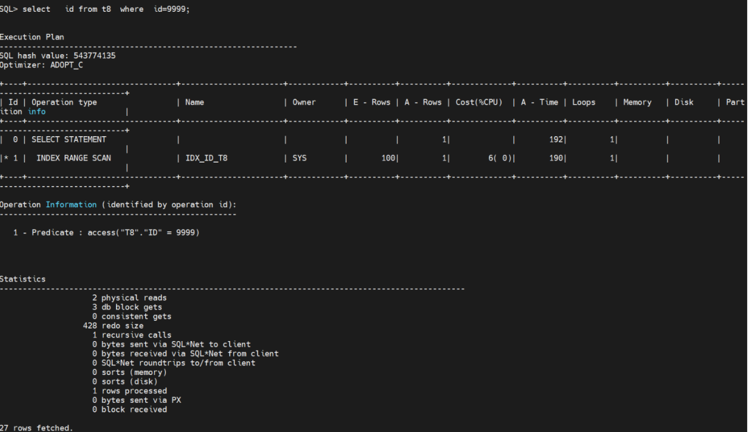 select id from t5 where id=9999; T5一万行的数据,索引查找花了2个db block