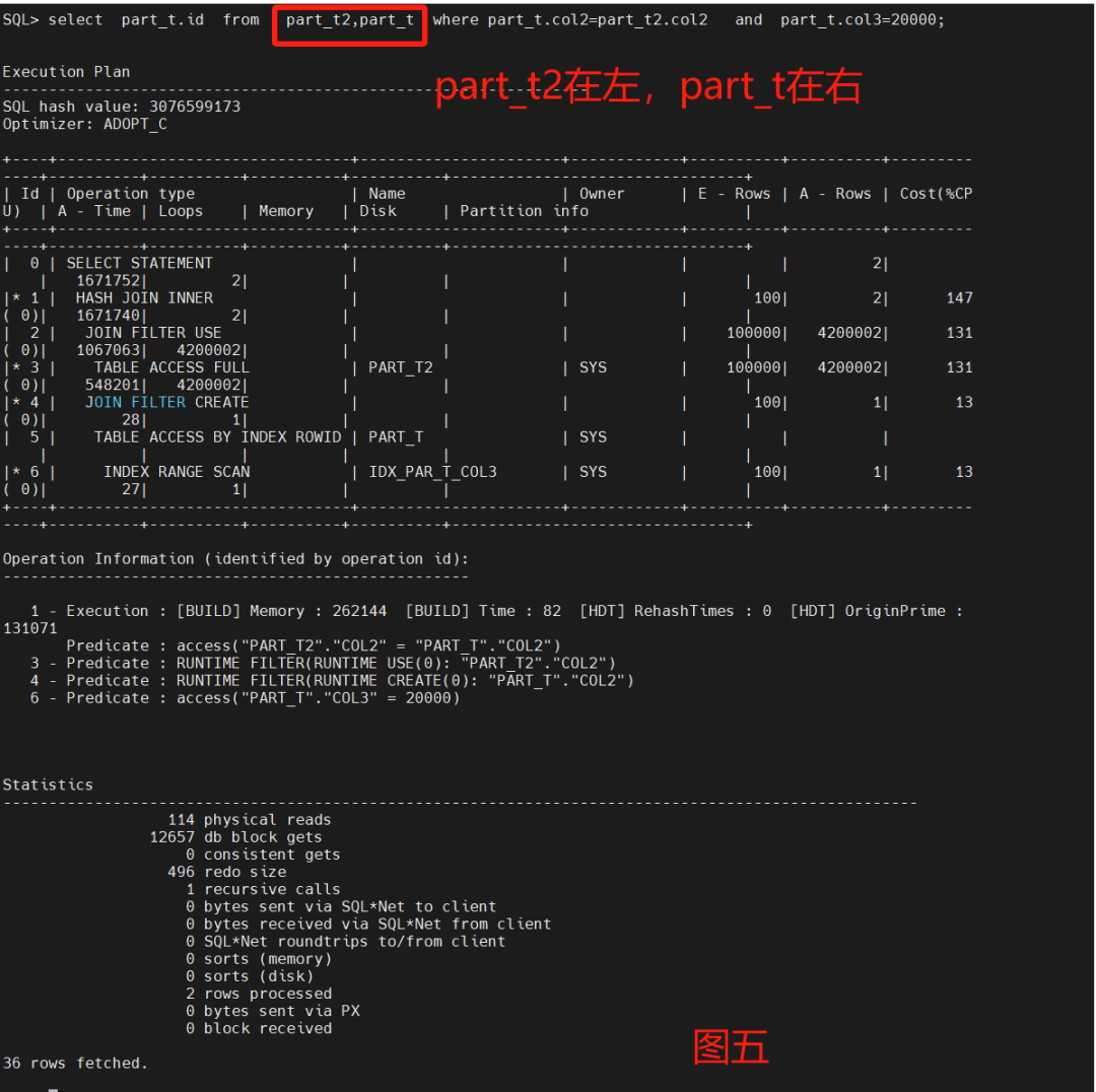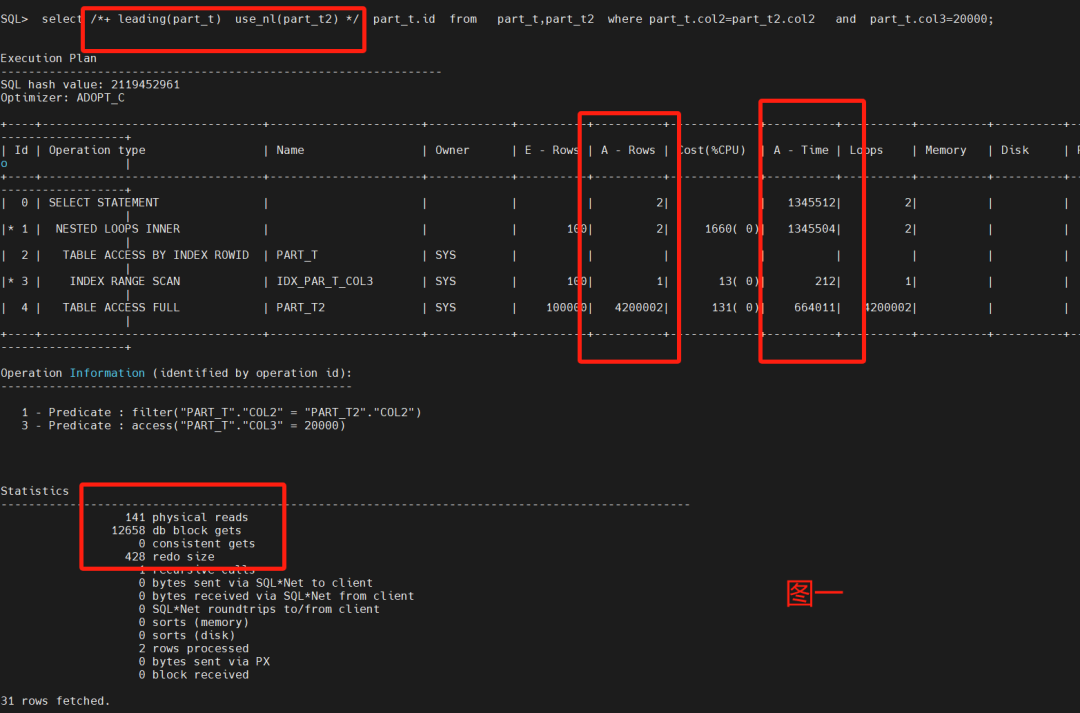 基于part_t表派生part_t2表,part_t2表插入1倍多的数据,part_t表是小表,part_t2表是大表。查看顺序和不同优先级、不同HINT指定下的扫描算子、块消耗、行消耗、行扫描。create table part_t2 as select * from part_t;insert into part_t2 select rownum,rownum+1,rownum+2 from dual connect by rownum<=2100000;ALTER SESSION SET statistics_level=ALL;set autotrace traceonly;select *+ leading(part_t) use_nl(part_t2) */ part_t.id from part_t,part_t2 where part_t.col2=part_t2.col2 and part_t.col3=20000;select *+ leading(part_t2) use_nl(part_t2) */ part_t.id from part_t,part_t2 where part_t.col2=part_t2.col2 and part_t.col3=20000;drop table part_t2 purge;drop table part_t purge;select *+ leading(part_t2) use_nl(part_t1) */ part_t.id from part_t,part_t2 where part_t.col2=part_t2.col2 and part_t.col3=20000;select *+ leading(part_t) use_nl(part_t1) */ part_t.id from part_t,part_t2 where part_t.col2=part_t2.col2 and part_t.col3=20000;select part_t.id from part_t,part_t2 where part_t.col2=part_t2.col2 and part_t.col3=20000;select part_t.id from part_t2,part_t where part_t.col2=part_t2.col2 and part_t.col3=20000;测试实验中出现YashDB的一个锁,记录YashDB的锁破解如下SQL> drop table part_t purge;YAS-02024 lock wait timeout, wait time 0 millisecondsSQL> select * from v$LOCKED_OBJECT;XEXT XNODE XSN OBJECT_ID SESSION_ID LMODE-------- -------- ------------ --------------------- ---------- ---------53 9603 1 2257 22 TSSQL> SELECT sid,serial# FROM V$SESSION WHERE sid IN (22);SID SERIAL#-------- ------------22 49631 row fetched.SQL> ALTER SYSTEM KILL SESSION '22,4963';Succeed.