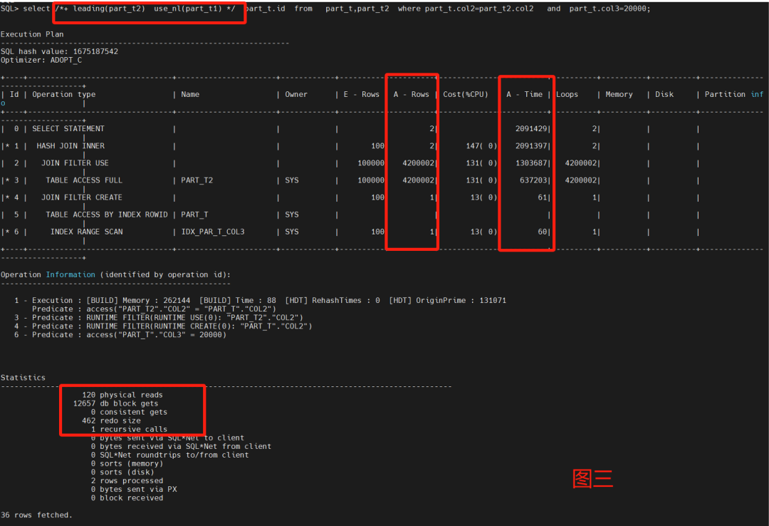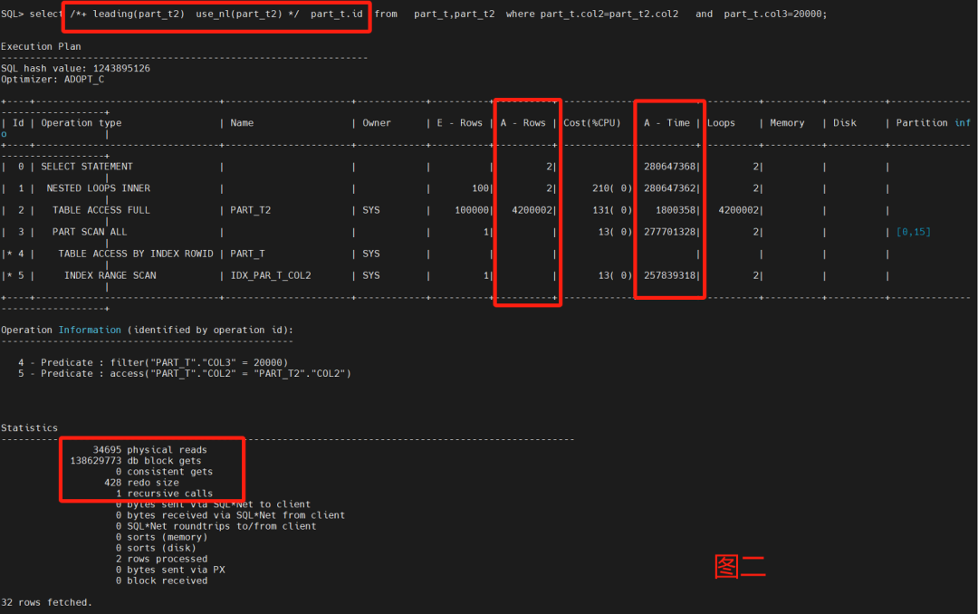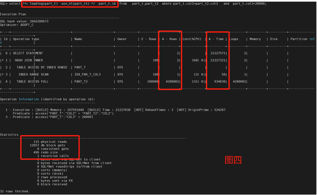 主要采用了嵌套循环来做两表的测试,不用leading和不同nl的呈现不同的走向,性能调优重点看Statistics以及A-Row、A-Time。