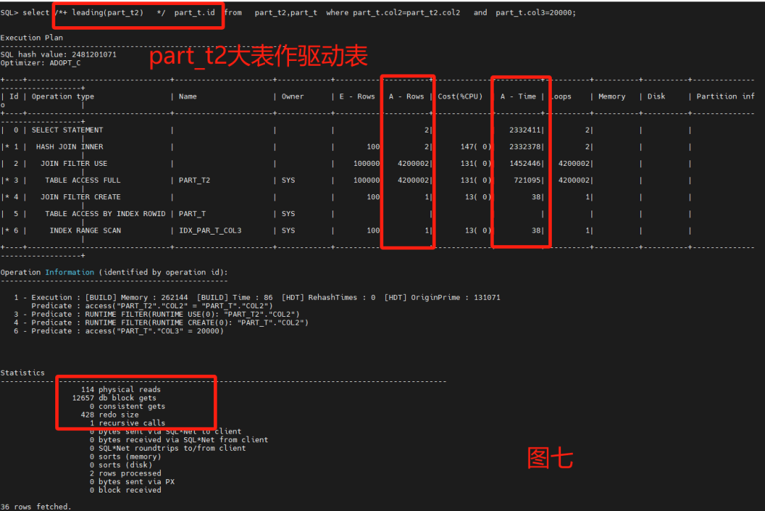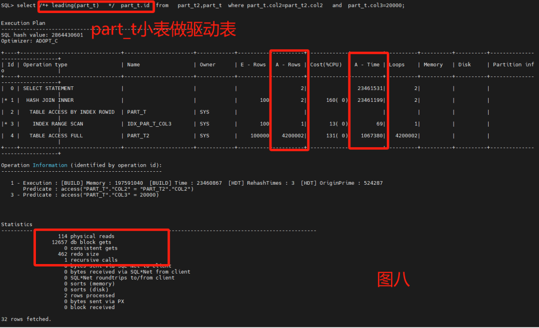 通过8图对比,leading是否选择小表对性能很关系,默认不加HINT也能跑出一个不错的性能,把大表和小表优先权倒置,优化器也能识别区分。