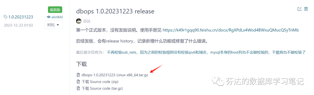 在没有正式版本之前,用户只能下载源代码,这可能包含未经测试的代码,对生产环境来说是不安全的。 dbops 的宗旨是追求精简高效。下载源代码会附带无用的 .git 目录,导致解压后的软件包体积增大两倍以上,从 36MB 暴增到 114MB。 发布正式版本能促使我记录修复的 bug 和新增的功能,这有助于用户在升级时了解如何适应这些变化。 正式版本在打包时会剔除源代码中的一些未完成项目,比如支持 keepalived 双主架构。由于我不支持这种架构,也没太多心思去开发,所以这个项目开发到 90% 就搁置了。正式版本不包含这些未完成的功能,防止用户错误使用。