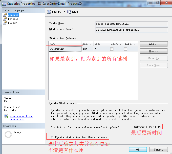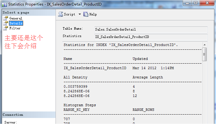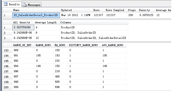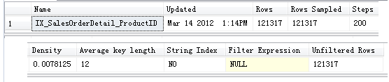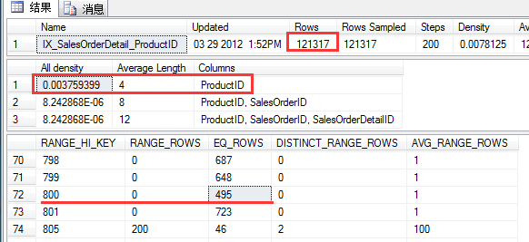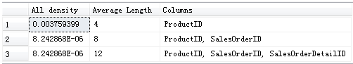 这里至于为什么会有3行,是因为【ProductID】为非聚集索引,【SalesOrderID,SalesOrderDetailID】为聚集索引,而每个非聚集索引中都包含有聚集索引的键值,所以这里的统计信息也出现了3个可选项。