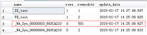 AUTO_CREATE_STATISTICS = ON 时,当将某列作为条件查询时,系统自动为每个条件列创建单列的统计信息。创建索引时也会自动创建相应的统计信息. 查询优化器通过使用 AUTO_CREATE_STATISTICS 选项创建统计信息时,统计信息名称以_WA 开头。