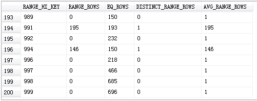 AVG_RANGE_ROWS | 重复列值位于直方图梯级内(不包括上限)的平均行数(如果 DISTINCT_RANGE_ROWS > 0,则为 RANGE_ROWS / DISTINCT_RANGE_ROWS)。 |