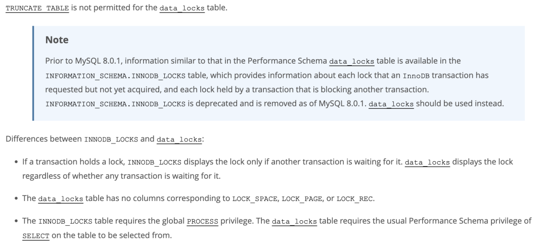 从 MySQL 8.0.1 开始 INFORMATION_SCHEMA.INNODB_LOCKS 被P_S 的 data_locks 表取代。
