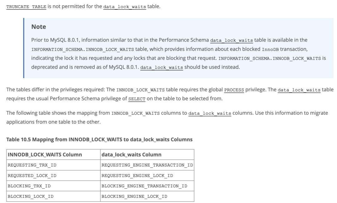https://dev.mysql.com/doc/mysql-perfschema-excerpt/8.0/en/performance-schema-data-lock-waits-table.html