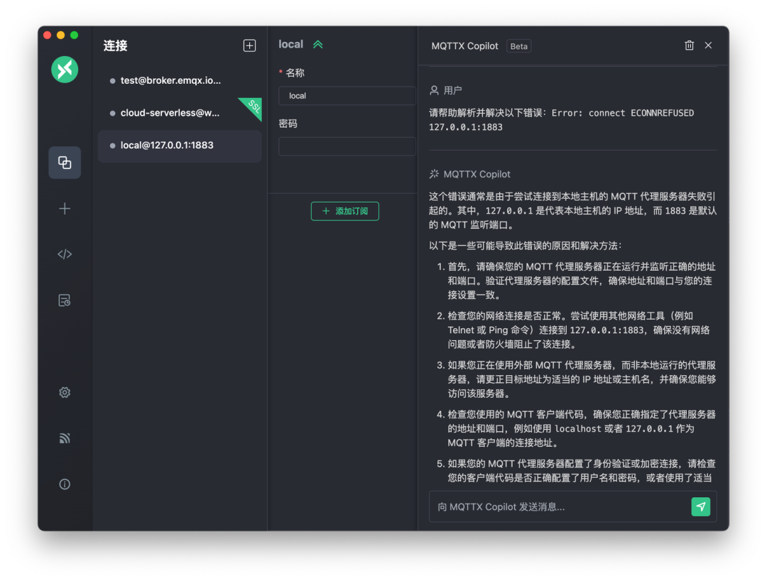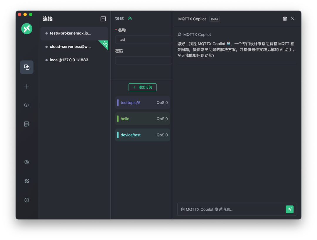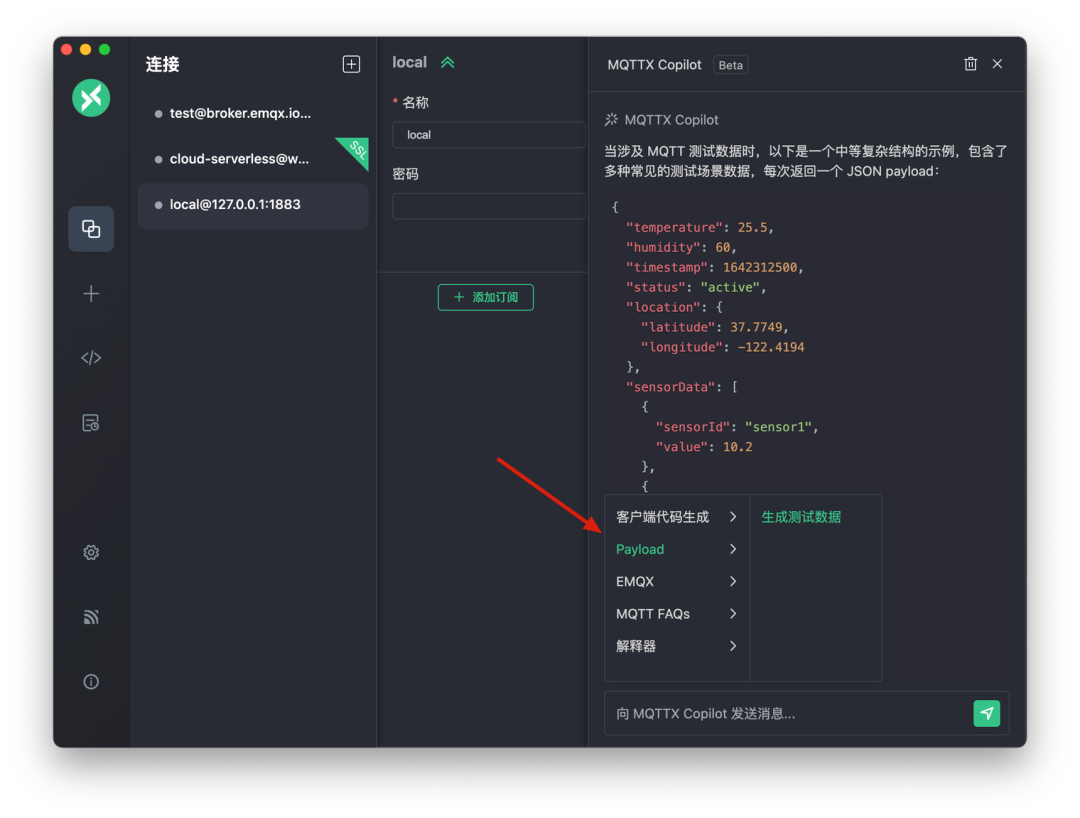 MQTTX Copilot 功能增强:升级以包含流输出、Payload 自动填充、Payload 的数据分析,以及根据提示信息自动创建连接和订阅主题等。