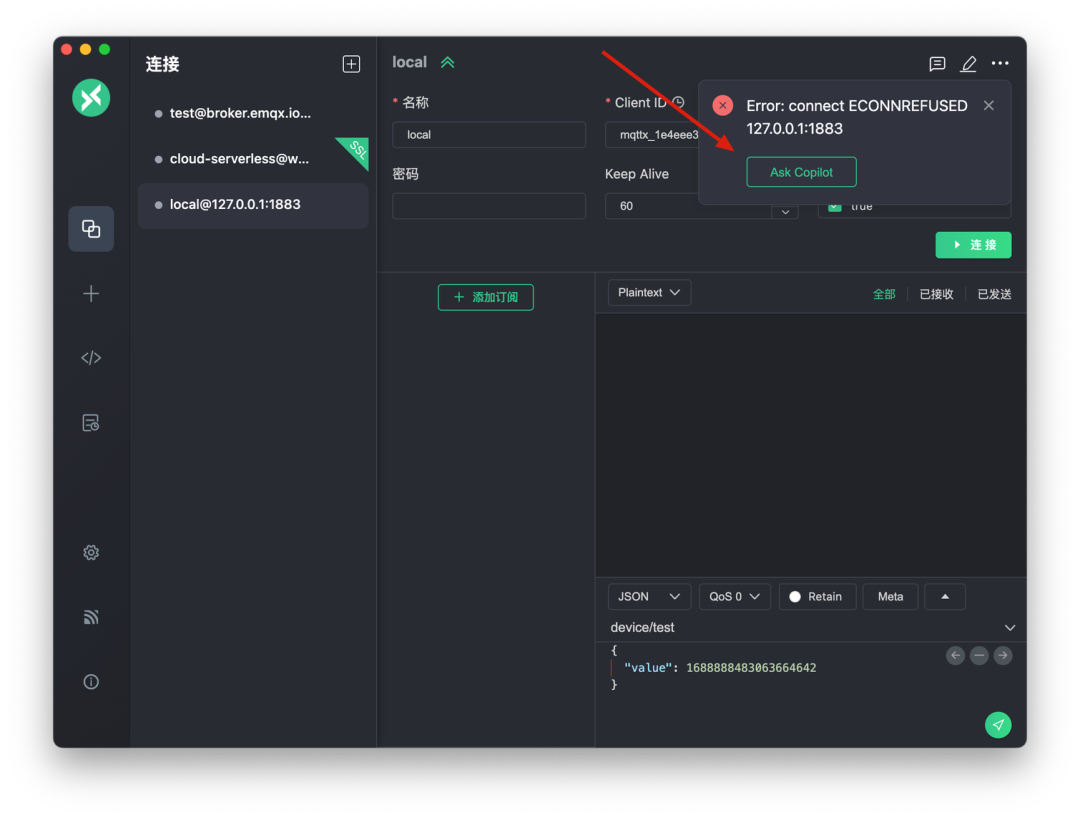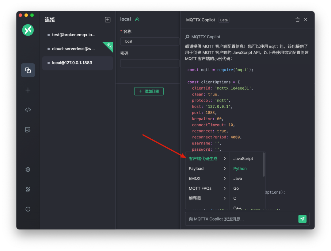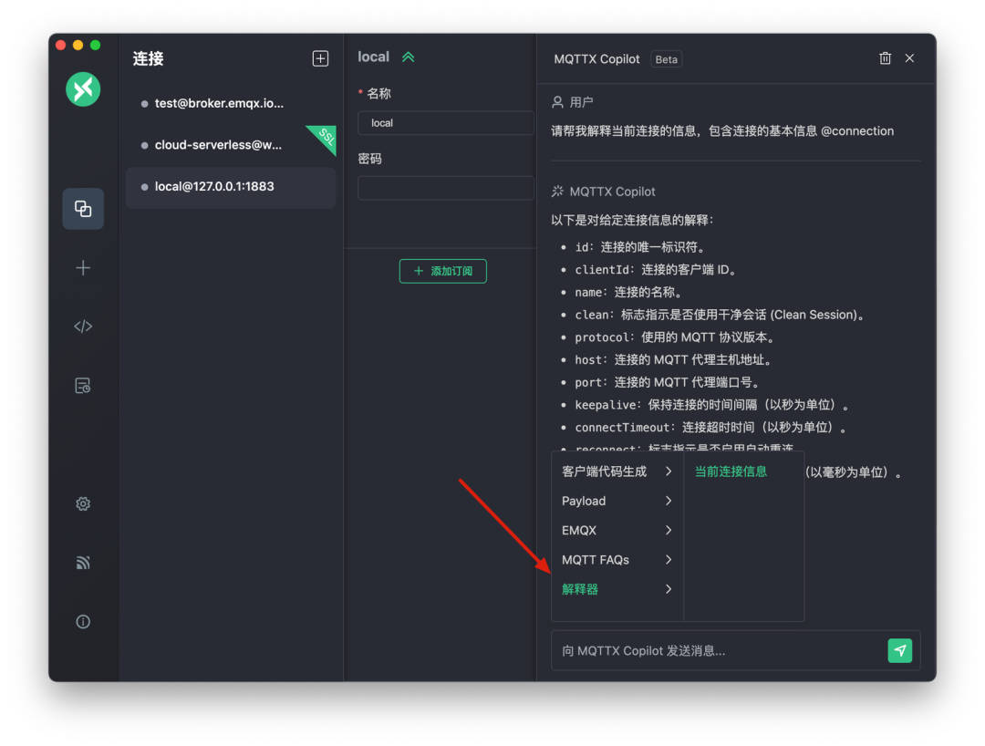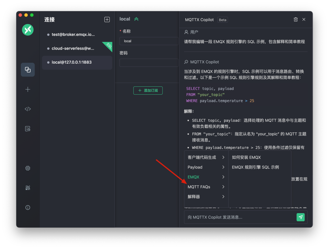 MQTTX Copilot 功能增强:升级以包含流输出、Payload 自动填充、Payload 的数据分析,以及根据提示信息自动创建连接和订阅主题等。