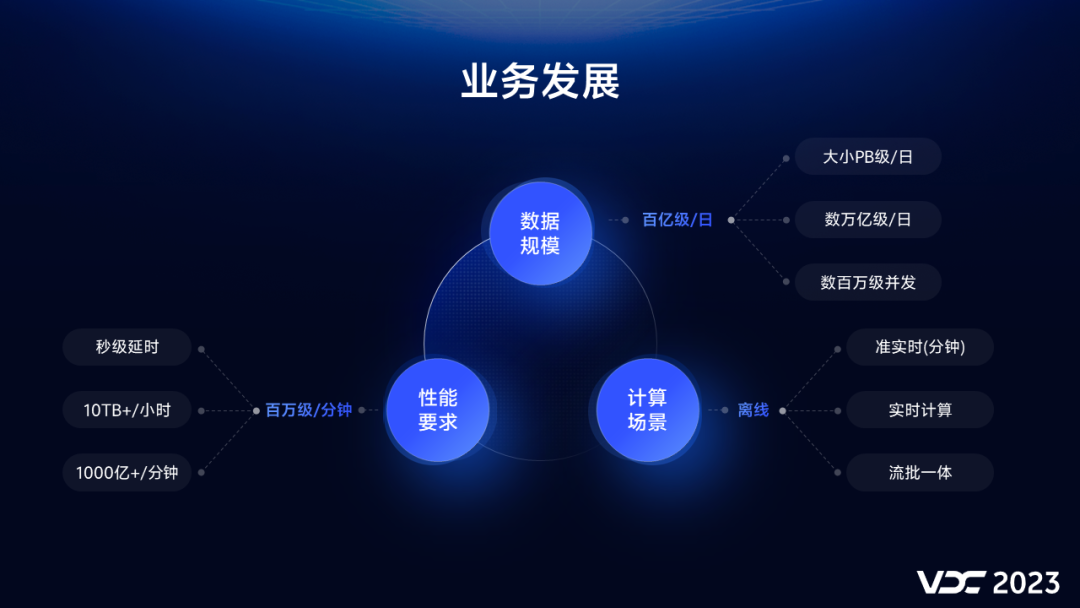 一是:数据规模增长,日增记录数从百亿到万亿级,日增存储量从GB级到PB级,实时并发QPS量级达到数据百万。