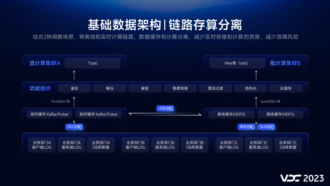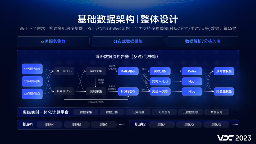 基础数据架构,从单链路升级到流批存算分离双活架构,多机房/集群/组件容灾,基础数据链路高可用。