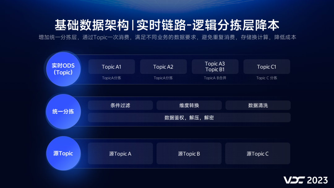 增加统一分拣层,通过Topic一次消费,满足不同业务的数据要求,避免重复消费,存储换计算,降低成本。