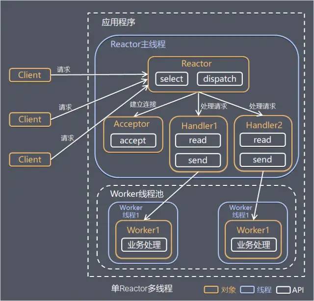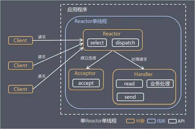Reactor对象通过select监控客户端请求事件,收到事件后通过dispatch进行分发