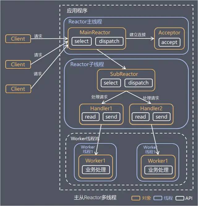 Reactor主线程MainReactor对象通过select监控建立连接事件,收到事件后通过Acceptor接收,处理建立连接事件