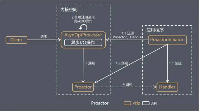 ProactorInitiator创建Proactor和Handler对象,并将Proactor和Handler都通过AsyOptProcessor(Asynchronous Operation Processor)注册到内核
