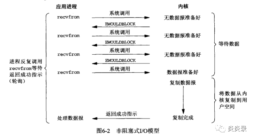 当应用程序通过系统调用recvfrom时(点个香辣口味的花甲粉丝),如果内核中的数据还没有准备好,不再阻塞进程,会立即返回一个error,应用程序可做其他事情,过一段时间再去拿数据(老板没做好,找个座位坐在玩手机)。应用程序为了得到数据,会循环进行系统调用,消耗大量的CPU资源(一遍遍去看看老板做好没),直到拿到数据。