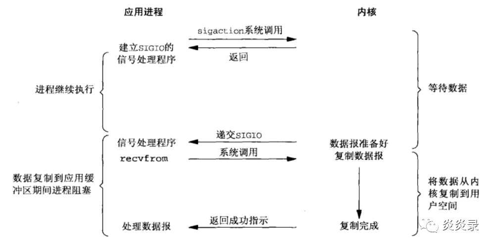 应用进程预先向内核注册一个信号处理函数(点完餐老板给块牌子),然后用户进程返回,不阻塞,当内核数据准备就绪时会发送一个信号给进程(牌子信号灯亮),才进行recvfrom系统调用进行数据拷贝。