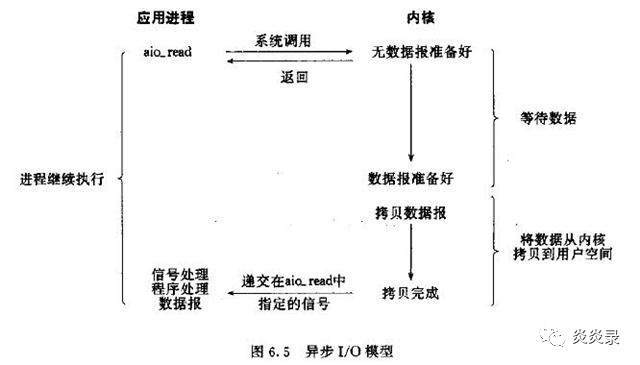 应用进程调用aio_read 函数,告诉内核描述字,缓冲区指针,缓冲区大小,文件偏移以及通知的方式,然后立即返回(扫码点餐),当内核将数据拷贝到缓冲区后,再通知应用程序(饭菜上桌)。